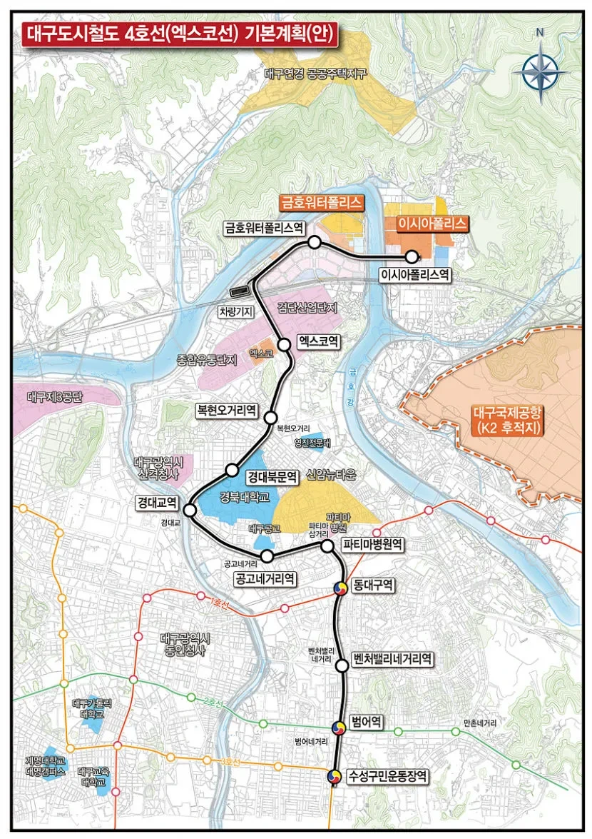 대구 지하철 4호선은 수성구민운동장부터 이시아폴리스까지 연결하는 노선으로 2026년 착공~3030년 개통을 목표로 추진 중에 있습니다.
