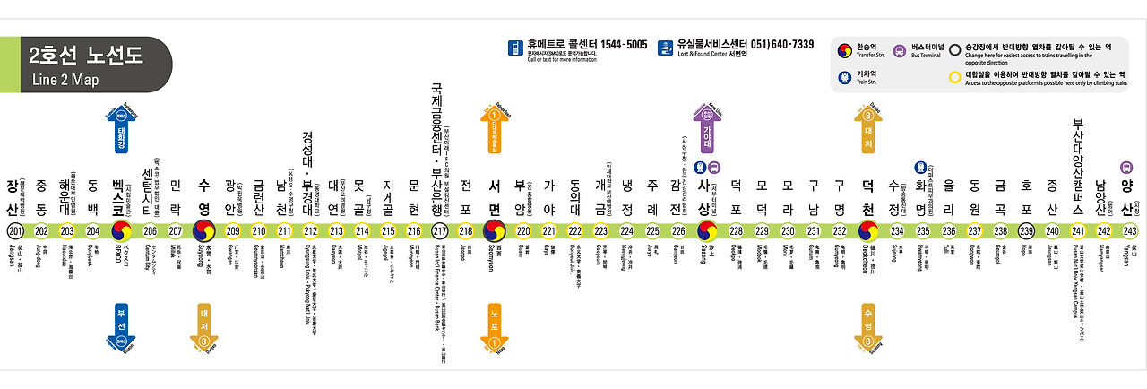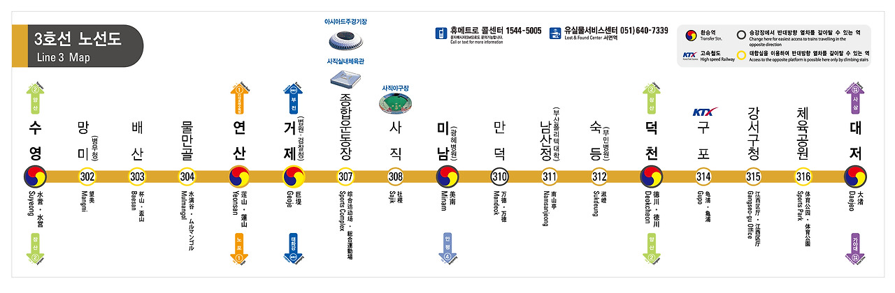 - 환승역: 수영역 (2호선), 연산역(1호선), 거제역(동해선), 미남역(4호선), 덕천역(2호선), 대저역(부산김해경전철)