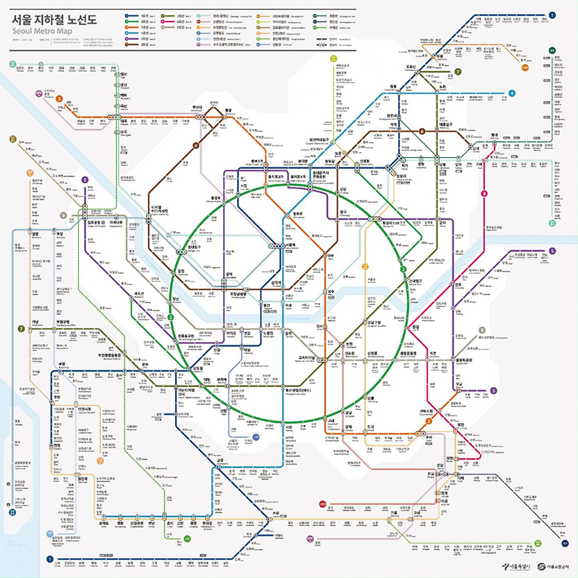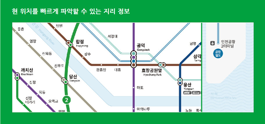 기존 노선도는 위치를 알기 어려운 노선도 형태, 일반역과 잘 구분이 되지 않는 환승역 표기, 공항·강·바다 등 지리적 위치에 대한 인지 부족, 역번호 표기 부재 등 이용객을 위한 배려가 부족했습니다.