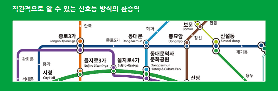 개선 디자인은 20~30대 내국인, 외국인을 대상으로 아이트래킹 실험 결과, 역 찾기 소요 시간은 최대 약 55%, 환승역 길 찾기 소요 시간은 최대 약 69% 단축되었으며, 특히 외국인의 길 찾기 소요 시간 감소 폭이 내국인보다 약 21.5% 더 높게 나타났습니다.수 있는 8선형 적용, 시인성 개선을 위한 신호등 방식의 환승역 표기, 위치 이해도를 높이는 지리 정보 표기, 노선 간 구분이 쉬운 색상 및 패턴을 적용하여 개선하였습니다.