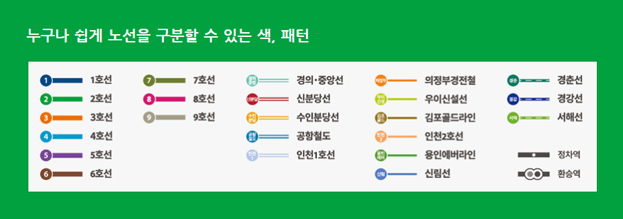 새롭게 발표한 노선도는 시각약자, 외국인 모두를 배려한 읽기 쉬운 디자인으로 지하철을 더욱 편하게 이용할 수 있도록 많은 노선과 환승역을 쉽게 인지할 수 있는 8선형 적용, 시인성 개선을 위한 신호등 방식의 환승역 표기, 위치 이해도를 높이는 지리 정보 표기, 노선 간 구분이 쉬운 색상 및 패턴을 적용하여 개선하였습니다.