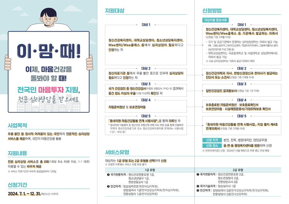 우울·불안 등 정서적 어려움으로 인해 심리상담이 필요한 국민에게 전문 심리상담 서비스를 총 8회(1회당 최소 50분 이상, 1:1 대면) 이용할 수 있는 바우처 제공