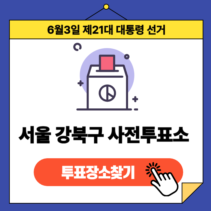 제21대 대통령선거(2025년 6월 3일) 서울특별시 강북구 유권자분들을 위한 사전투표소 정보 안내글입니다.