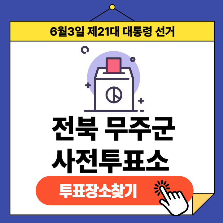 제21대 대통령선거(2025년 6월 3일) 전북특별자치도 무주군 유권자분들을 위한 사전투표소 정보 안내글입니다.