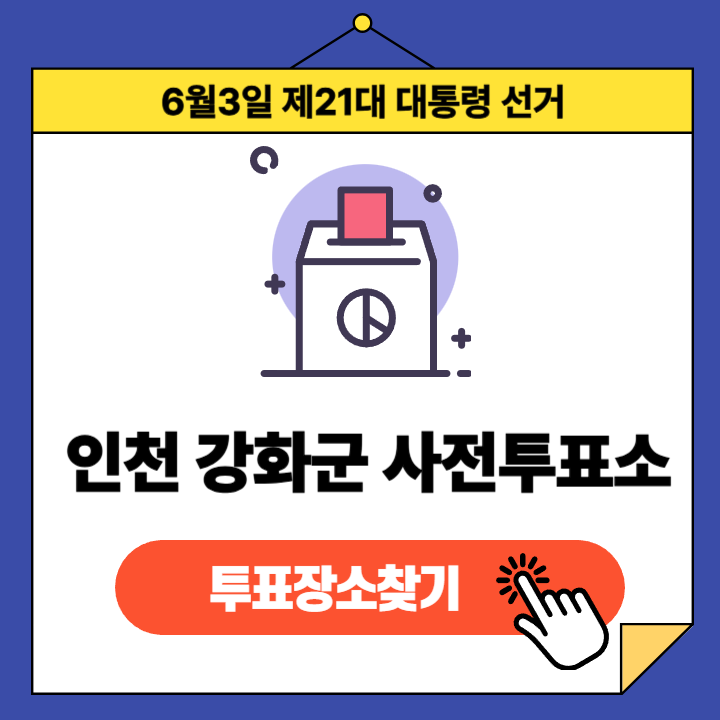 제21대 대통령선거(2025년 6월 3일) 인천광역시 강화군 유권자분들을 위한 사전투표소 정보 안내글입니다.