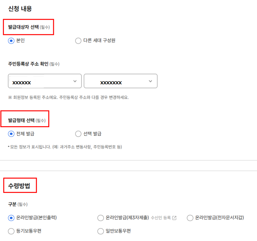 - 수령 방법 선택: "온라인 발급(본인 출력)" 또는 "온라인 발급(전자문서지갑)" 중 원하는 수령 방법을 선택합니다. 필요에 따라 "우편 수령"을 선택할 수도 있습니다. (우편 수령 시에는 추가 정보 입력 및 수수료가 발생할 수 있습니다.)