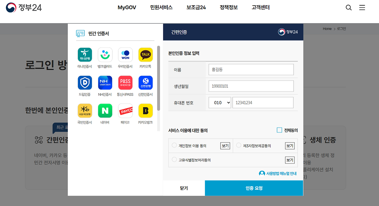 - 본인 인증: 반드시 본인 명의의 인증서 또는 간편인증 수단을 사용하여 로그인해야 합니다. 타인의 정보로 발급받는 것은 불법 행위에 해당될 수 있습니다.
