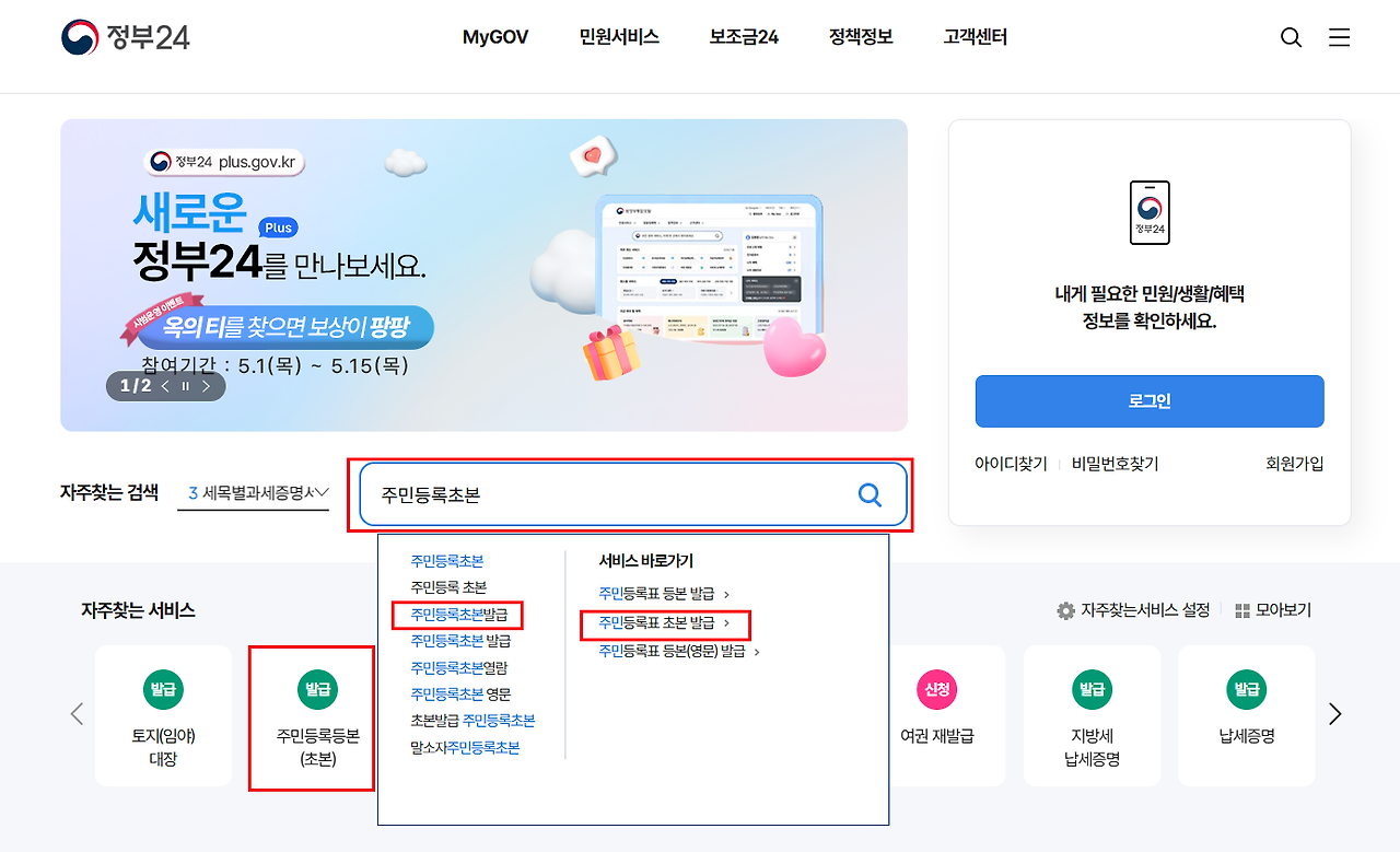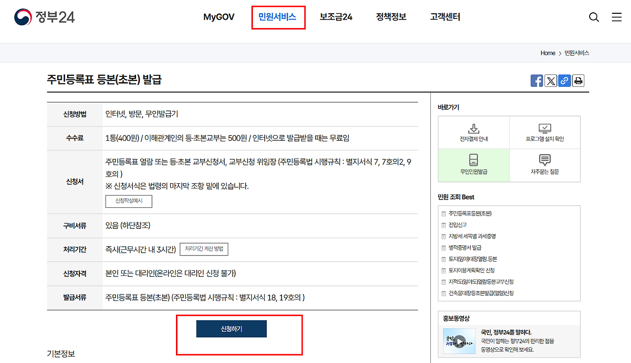 - 빠른 이동: 정부24 메인 페이지의 "자주 찾는 서비스" 또는 "민원 24" 메뉴에서도 "주민등록표초본 발급" 항목을 찾을 수 있습니다.