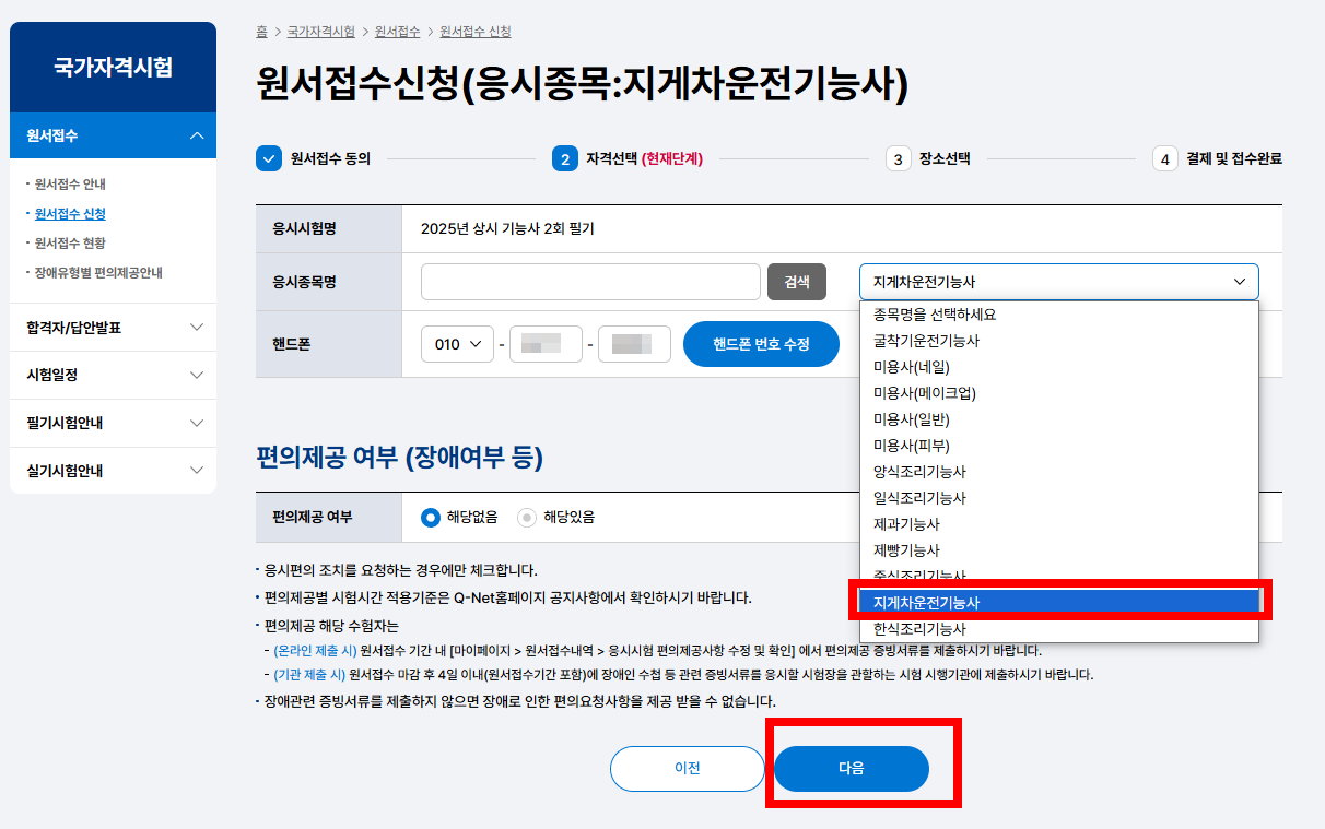 응시시험 /시험구분/접수종목/시험일시/시험장소/편의제공사항/결제상태